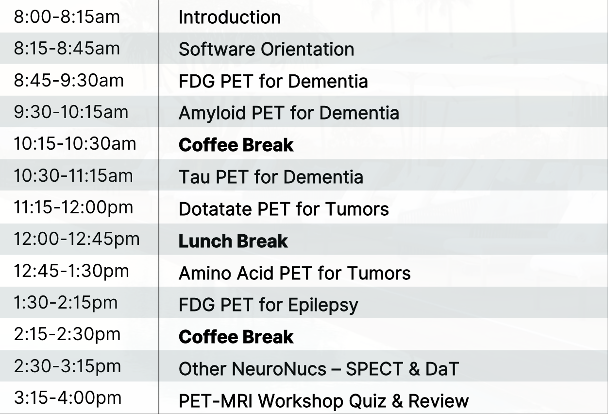 This full-day workshop provides practical didactic and hands-on experience with clinical PET-MRI, including use of surface and blended images for the enhanced diagnosis of different neurological diseases. Attendees will gain familiarity with the indications, advantages and imaging appearance of PET studies for dementia, epilepsy and other diseases through a case-based review with experts.