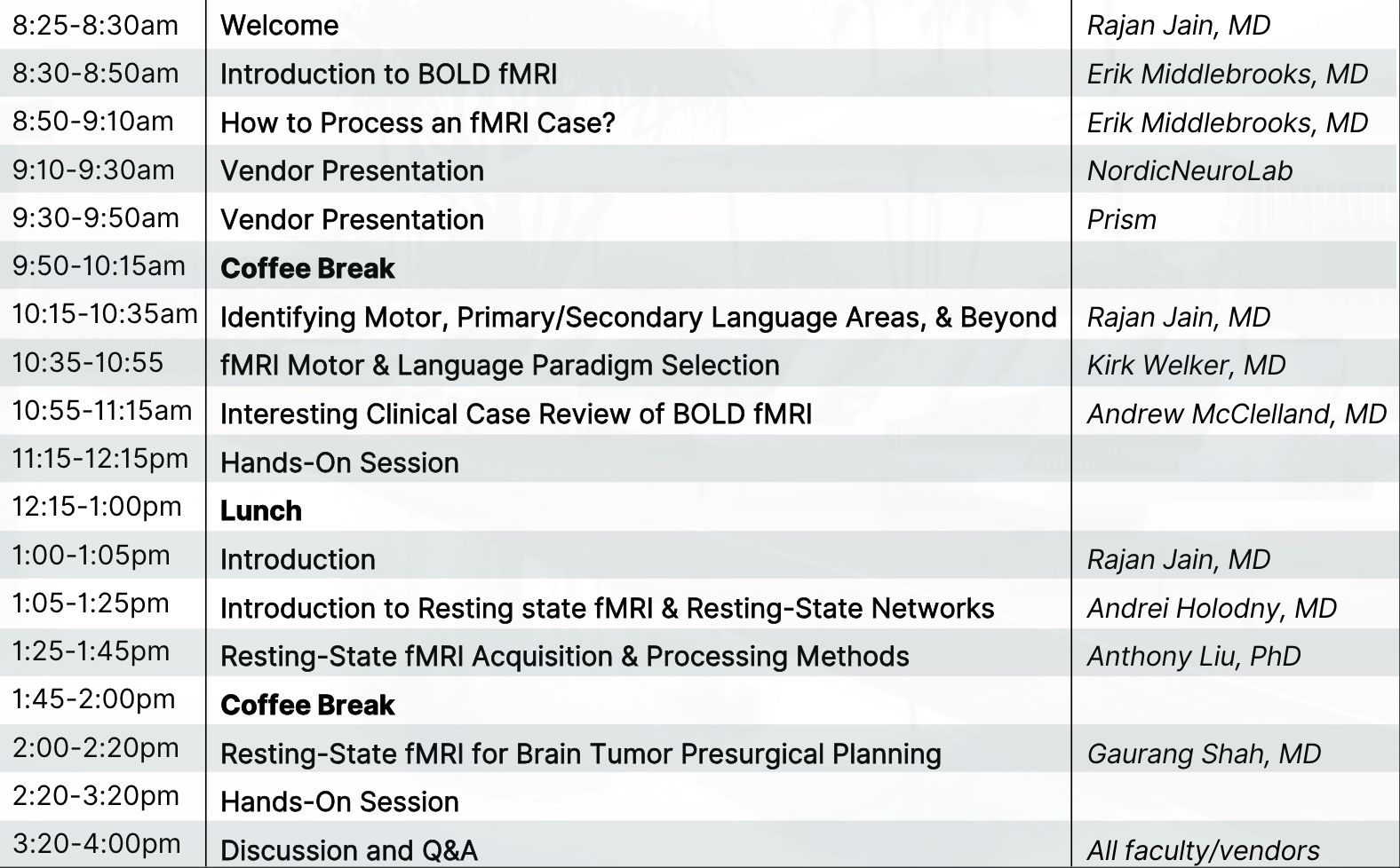 This full day workshop provides didactic and hands-on experience with clinical fMRI, including task-based language and motor mapping, as well as an introduction to DTI and resting-state fMRI. The aim of the workshop is to equip attendees with the foundation to begin or enhance their own clinical fMRI program.
