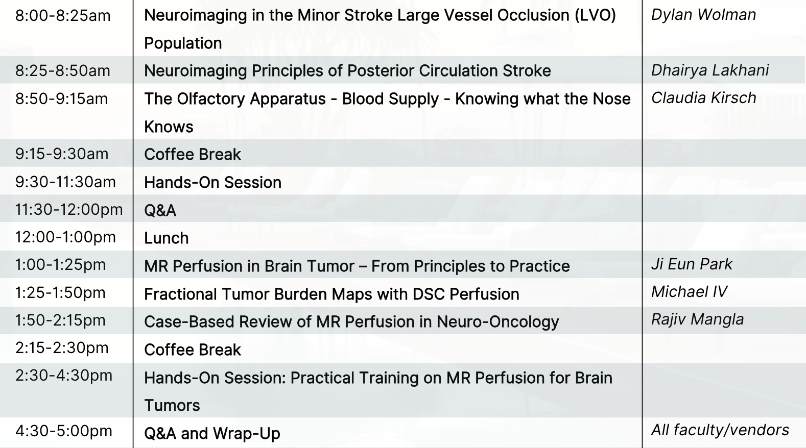 This full-day workshop will cover applications of perfusion imaging related to stroke and neuro-oncology. During the first half of the workshop, we will review the basic techniques of CT perfusion and MRI perfusion techniques such as dynamic susceptibility contrast and arterial spin labeling , as they pertain to acute ischemic stroke. We will then focus on how perfusion imaging can be utilized for detection and prognostication in stroke caused by vessel occlusions through case illustrations. Lastly, through a case-based review, we will touch on the utility of perfusion imaging with respect to stroke mimics.